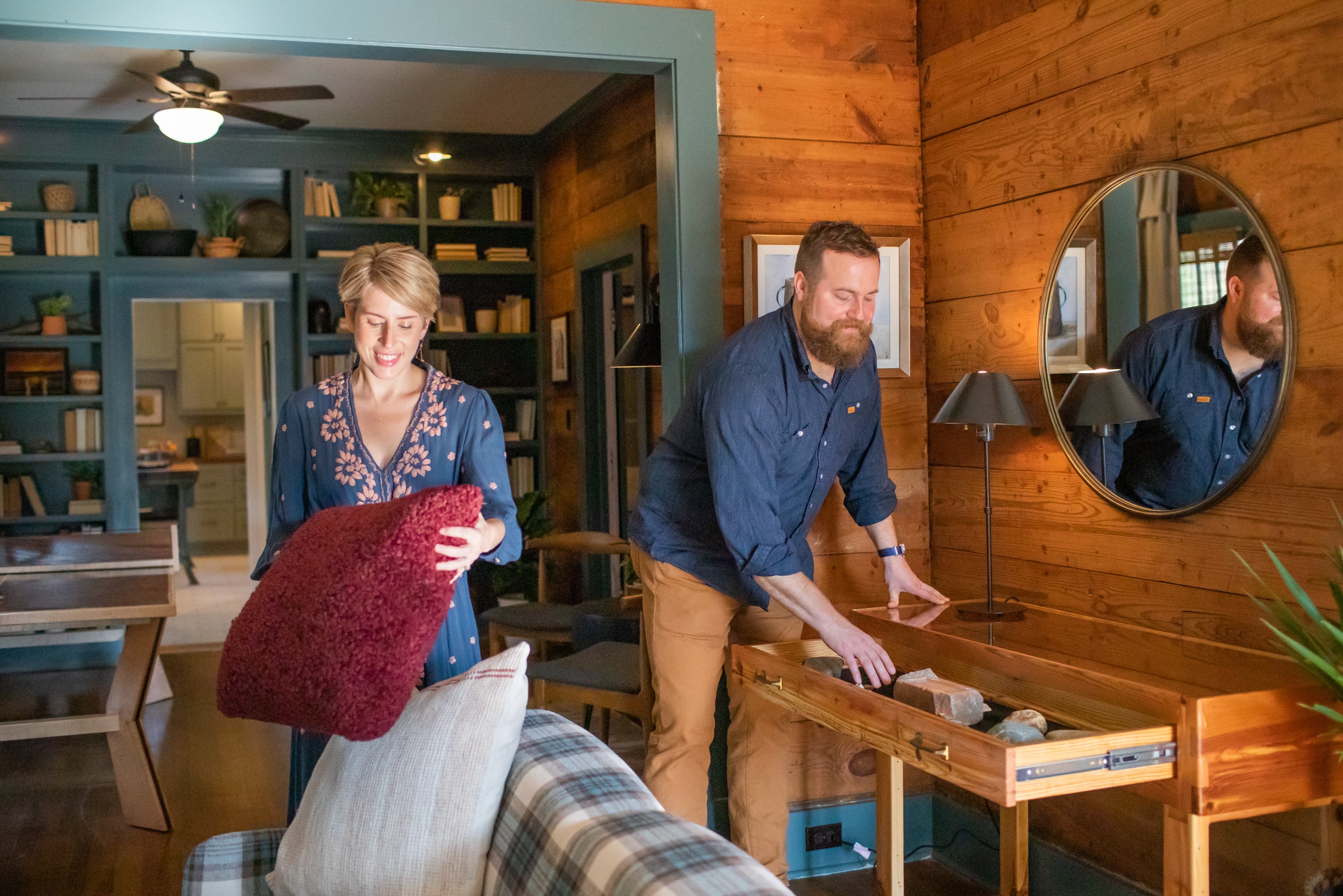 Luke describes his home, "Erin had asked me about the ultimate color palette for my house, and I gave her vintage national park posters. They made the interior feel like a cabin with the exposed wooden floors and walls with the blue-ish green trim. It was like a big swatch of color with real earthy tones. The mantel and the bookcase just became these focal pieces that make my home feel so comfortable and relaxing."